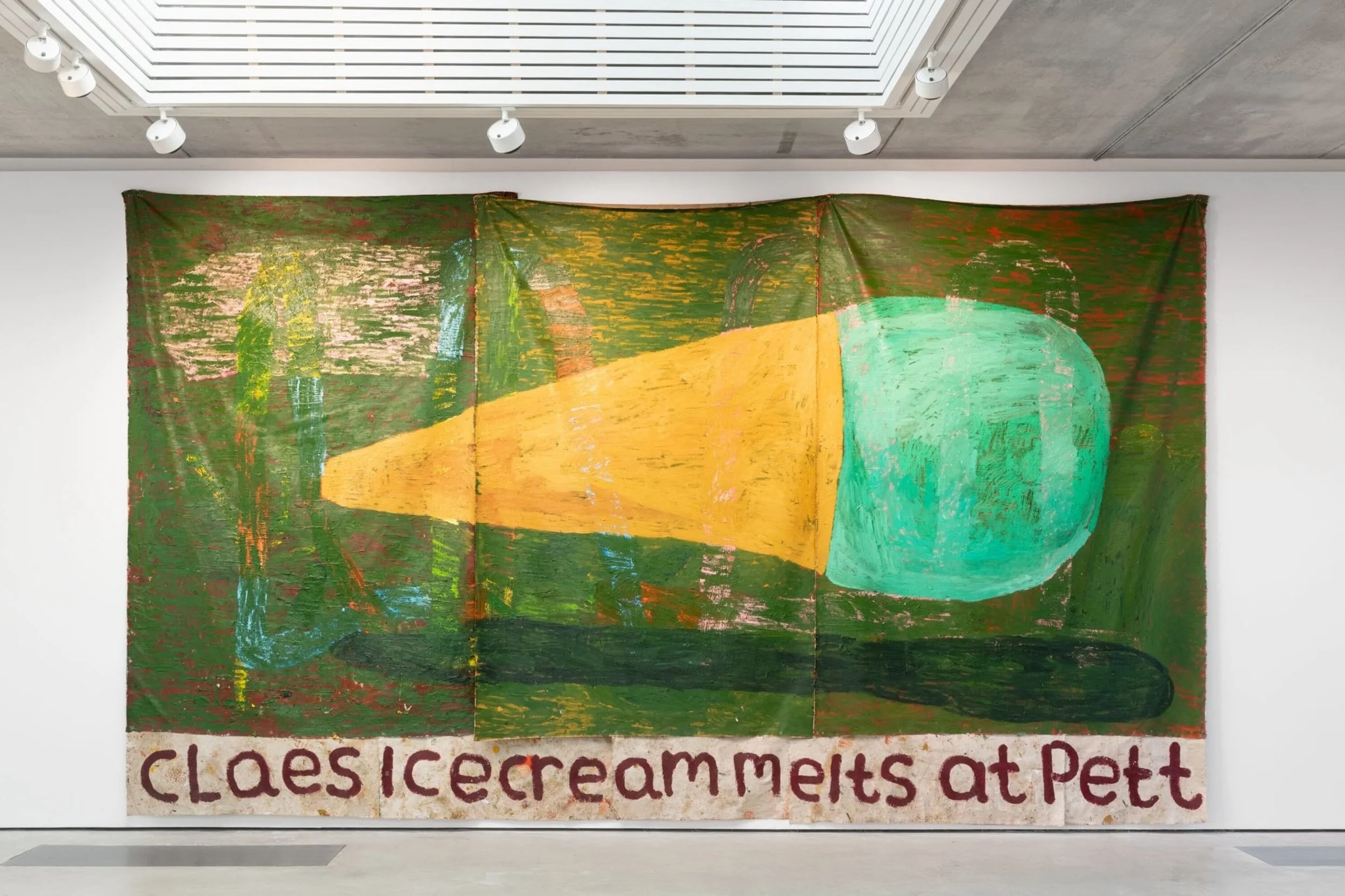 There is something endearing about a mackerel sky: soft, fluffy clouds like little, round sheep, the pretty white-on-blue celestial design. Sophie Barber seems to think so, too: her exhibition at Hastings Contemporary, the first in her hometown of Hastings, is titled Mackerel sky, mackerel sky, never long wet, never long dry. Titles have always been an important part of Barber’s work, appearing at the bottom of her paintings like captions, thick and smeary and coloured blood-red. Sometimes, the words are misspelt, as in The Year Your Born (2025), which is partly because – as the interim gallery director, Kathleen Soriano, tells us – the artist is dyslexic, but I get the impression that it is more the inherent sense of imperfection and directness to which Barber is drawn.