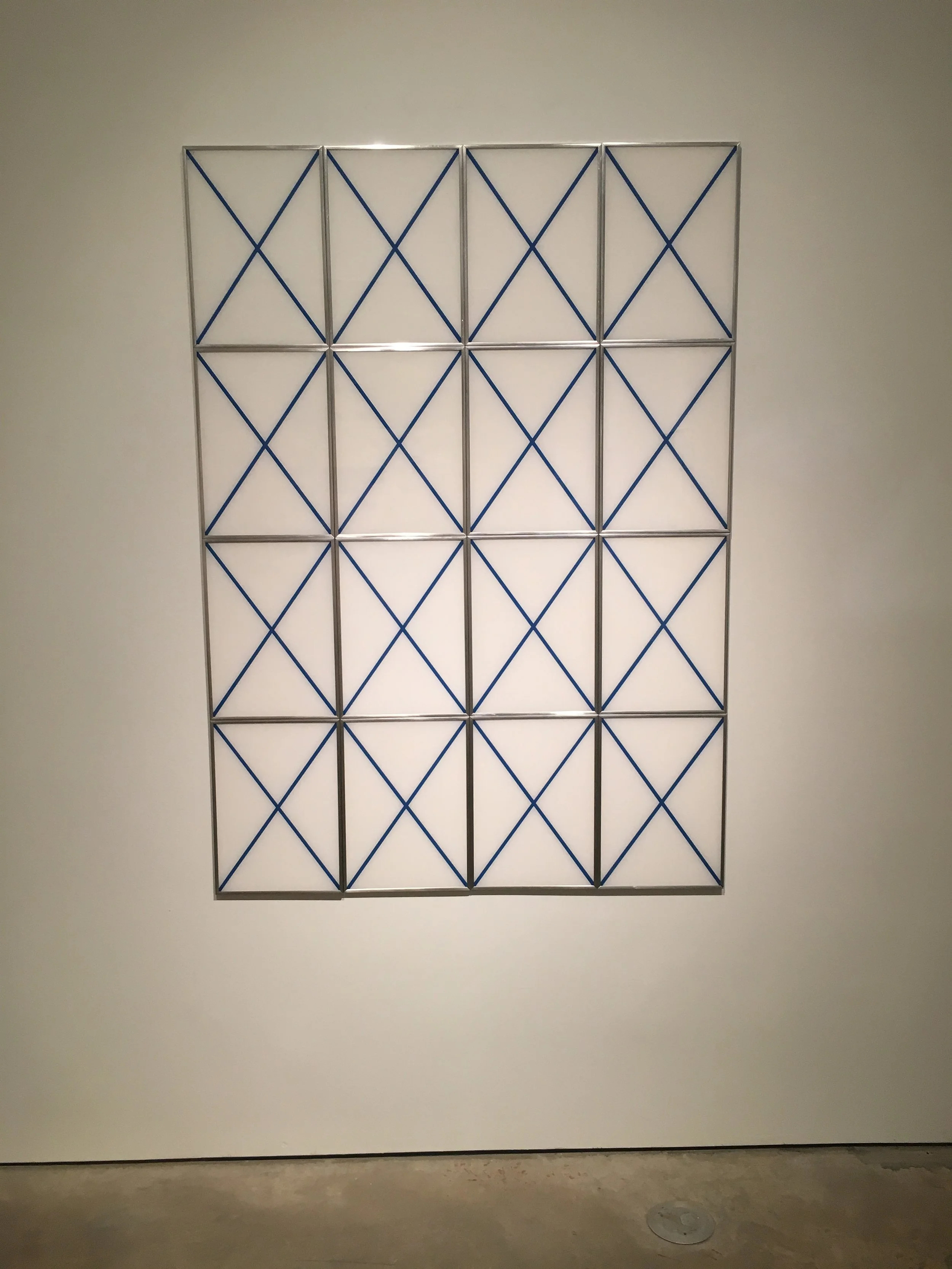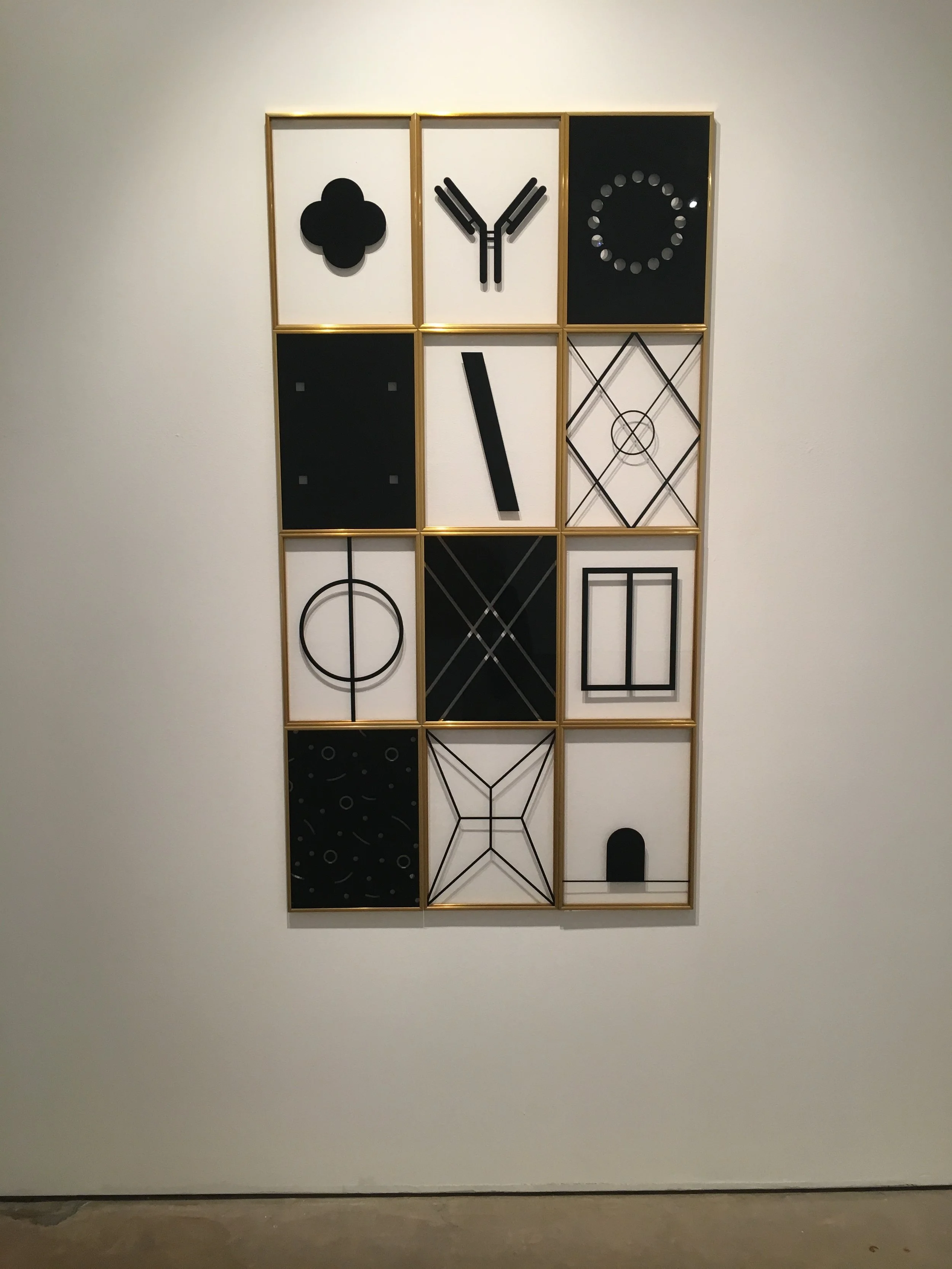 In Houston, another ‘digital native’ caught my attention. Guerrero Projects – a brand new Houston art space opened in 2016 and showing mainly Latin American artists – is showing work by Columbian artist Santiago Pyniol in a show titled Screaming at the Screen. Pinyol’s works are all literally screens: instead of a canvas Pinyol uses shop-bought A4 sized frames, which he installs in grid-like formations. The transparent backgrounds are marked with clear geometric shapes executed in black and white, or in bright-coloured enamel.